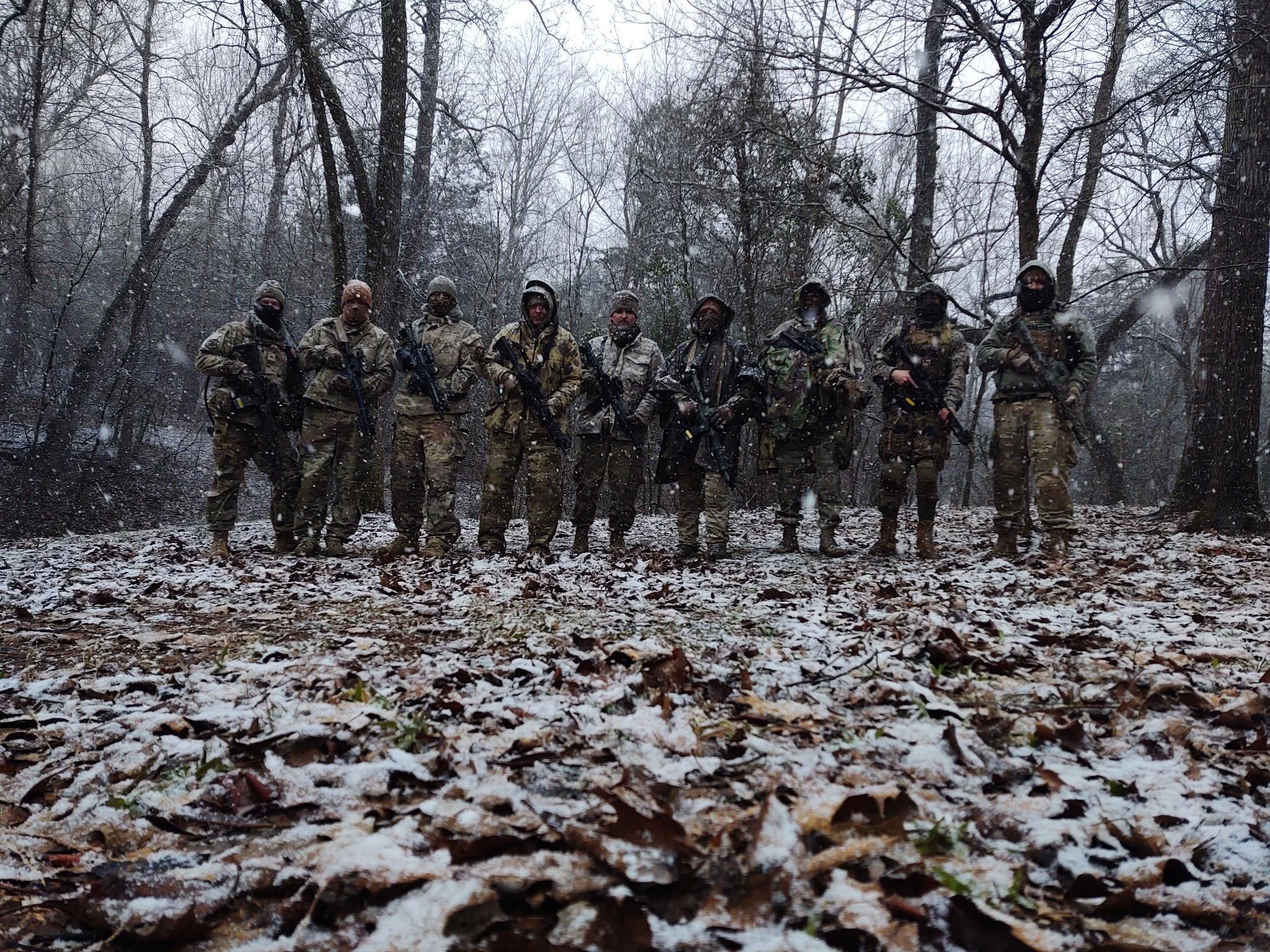 Man kneeling and aiming a rifle at a shooting range while wearing a tactical vest and cap, surrounded by other individuals in tactical gear during a training session.