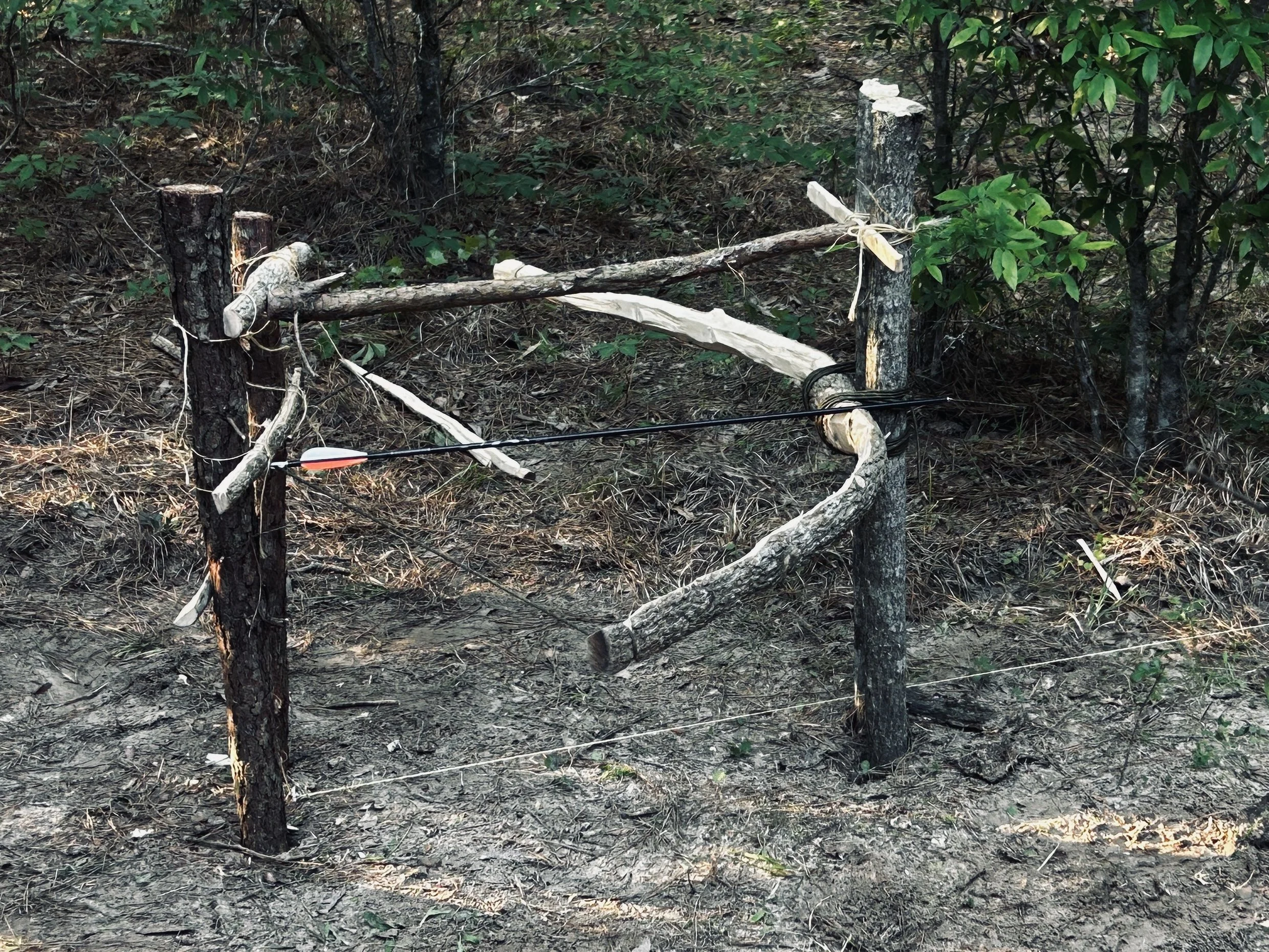 A group of people practicing shooting at an outdoor shooting range, with several shooting targets positioned on a wooden frame against a wooded background.