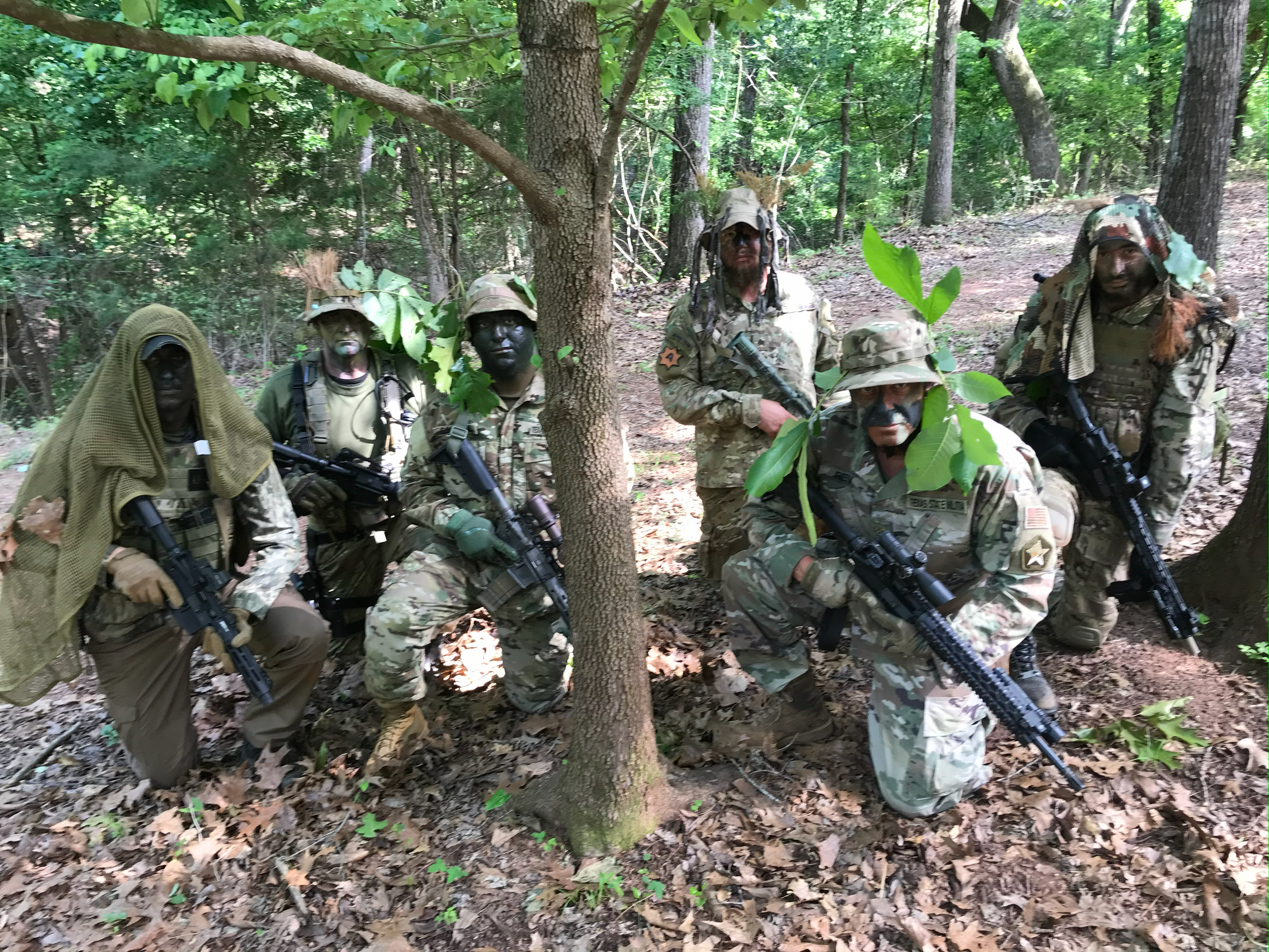 Group of four military personnel in camouflage uniforms having a discussion, one person is holding papers, and another has a rifle with camouflage cover on head.